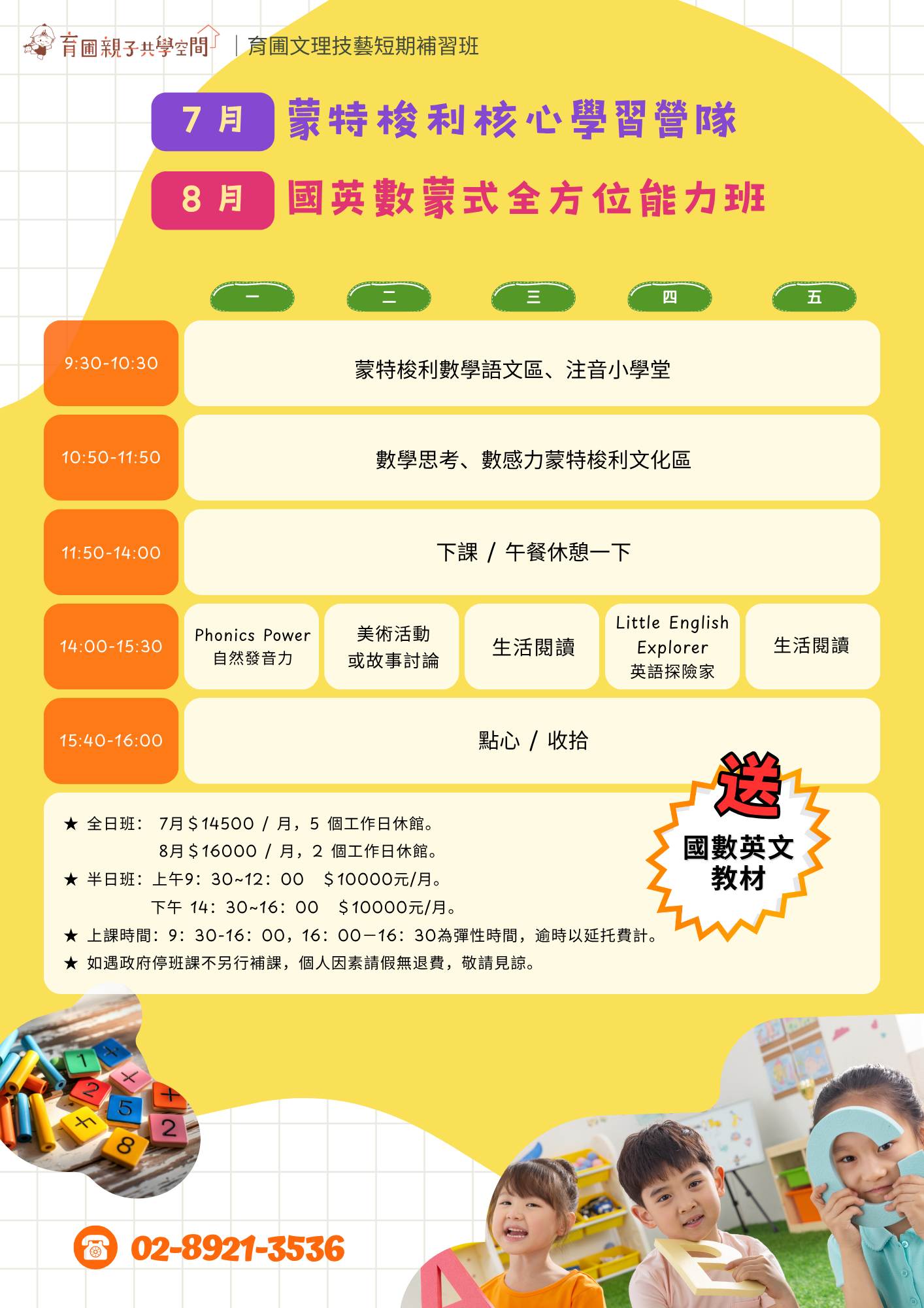 ★ 半日班:上午 10000元/月、850/天,單日10天內適用方案。 9:30~12:00 國數課程送教材。