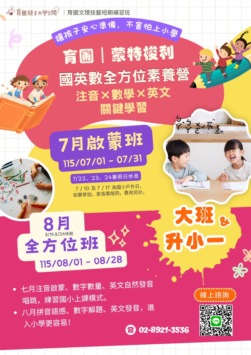 育圃教育特別規劃「蒙特梭利小一銜接學習力計畫」,整合正音、數學、英文三大核心能力,協助孩子從容銜接小學生活,建立自信與學習習慣。